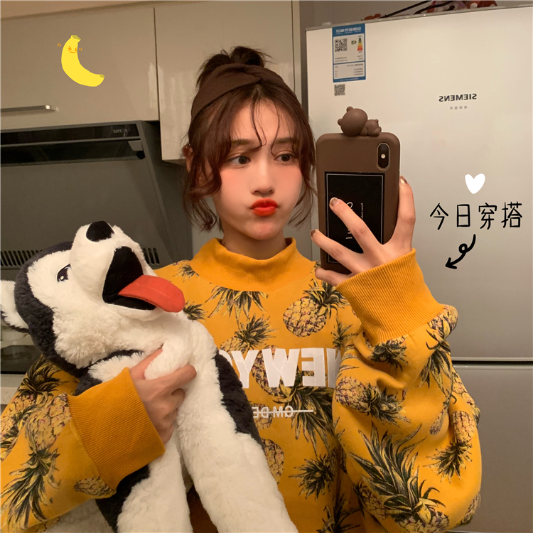 2018新款秋冬韓版中長款原宿風菠蘿字母小高領加絨加厚衛衣外套女