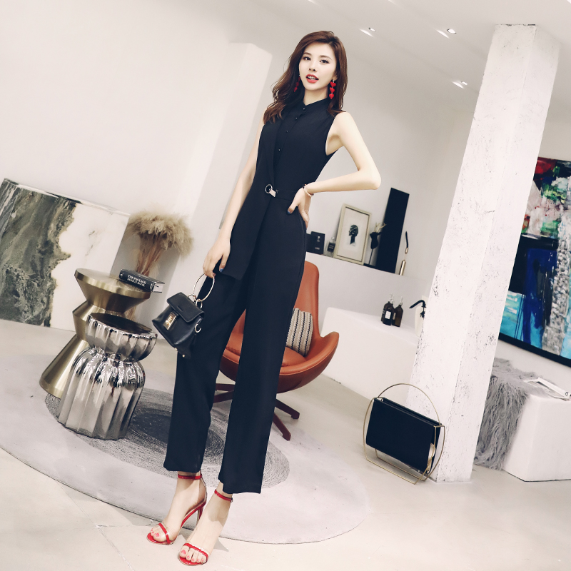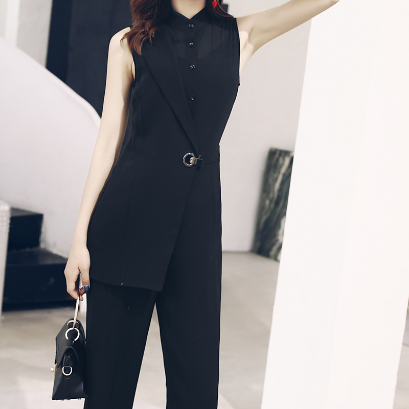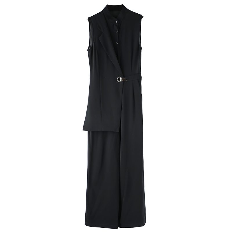 / 夏裝女不規則赫本職業連衣褲chic顯瘦高腰吊帶黑色連體闊腿褲套裝