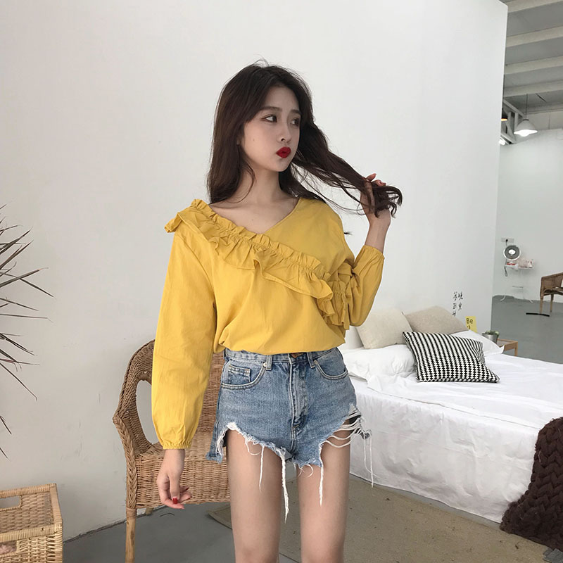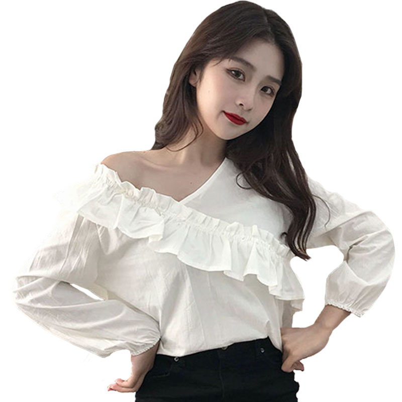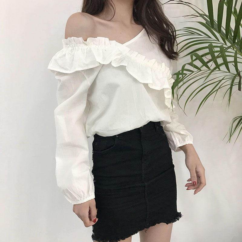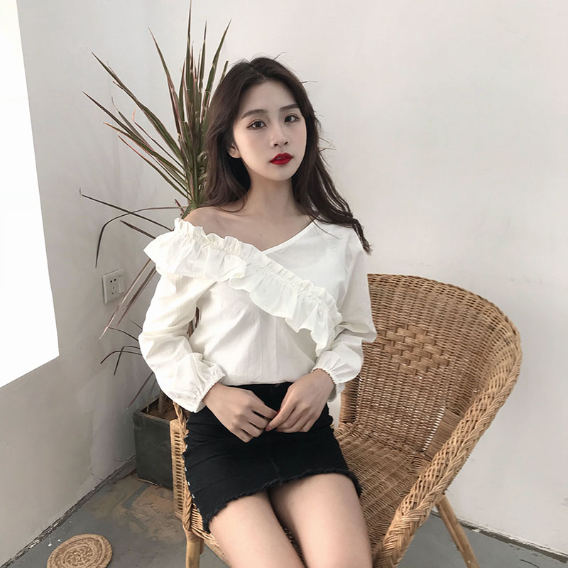 / 秋裝女裝韓版寬松花邊一字肩氣質露肩長袖白襯衫打底衫襯衣上衣潮