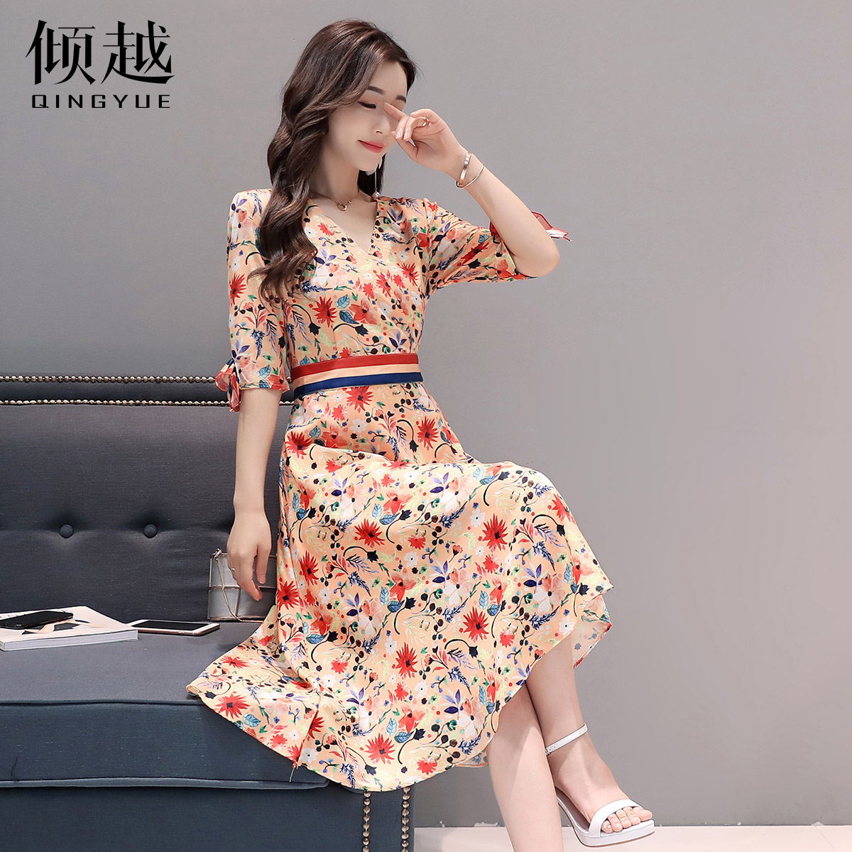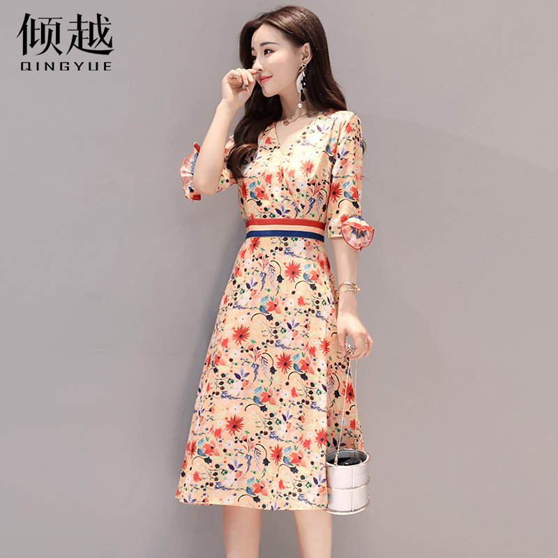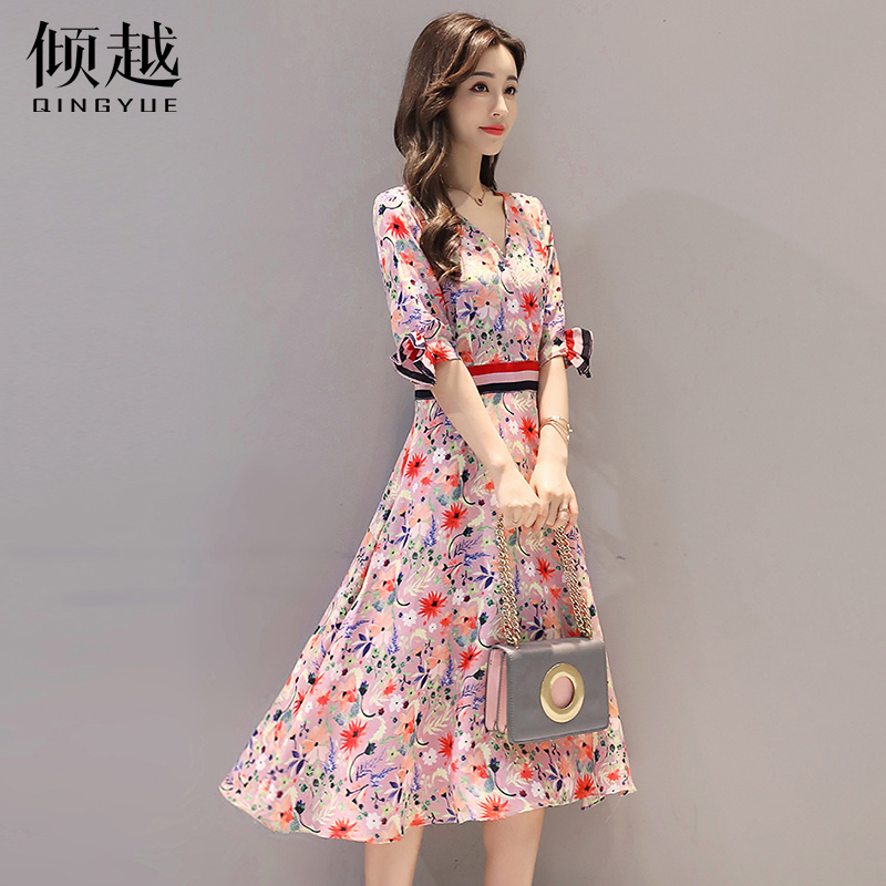 碎花v領連衣裙短袖女夏季新款2017顯瘦氣質印花中長款收腰仙女裙