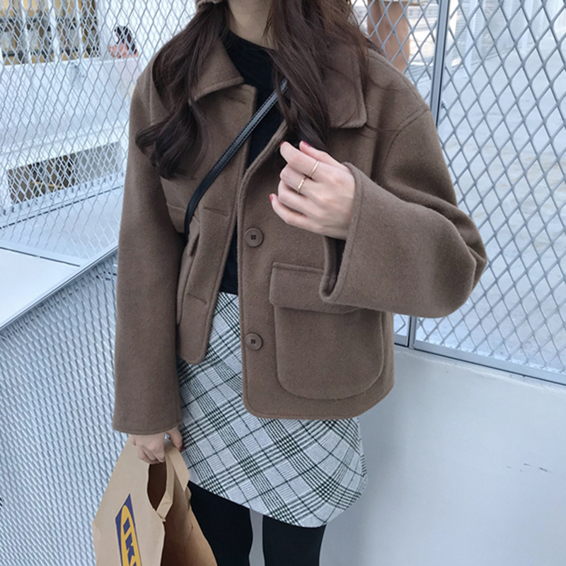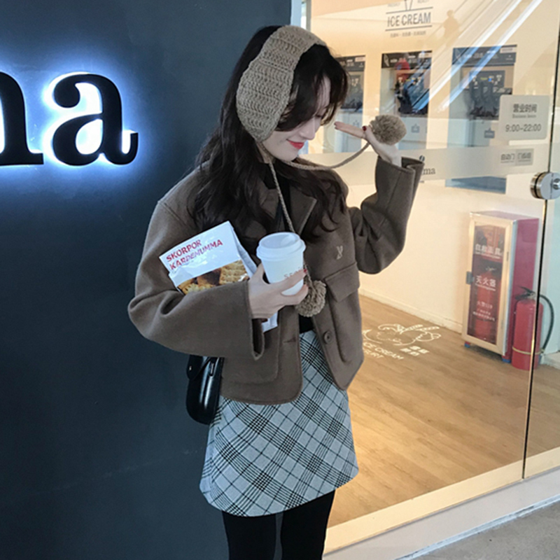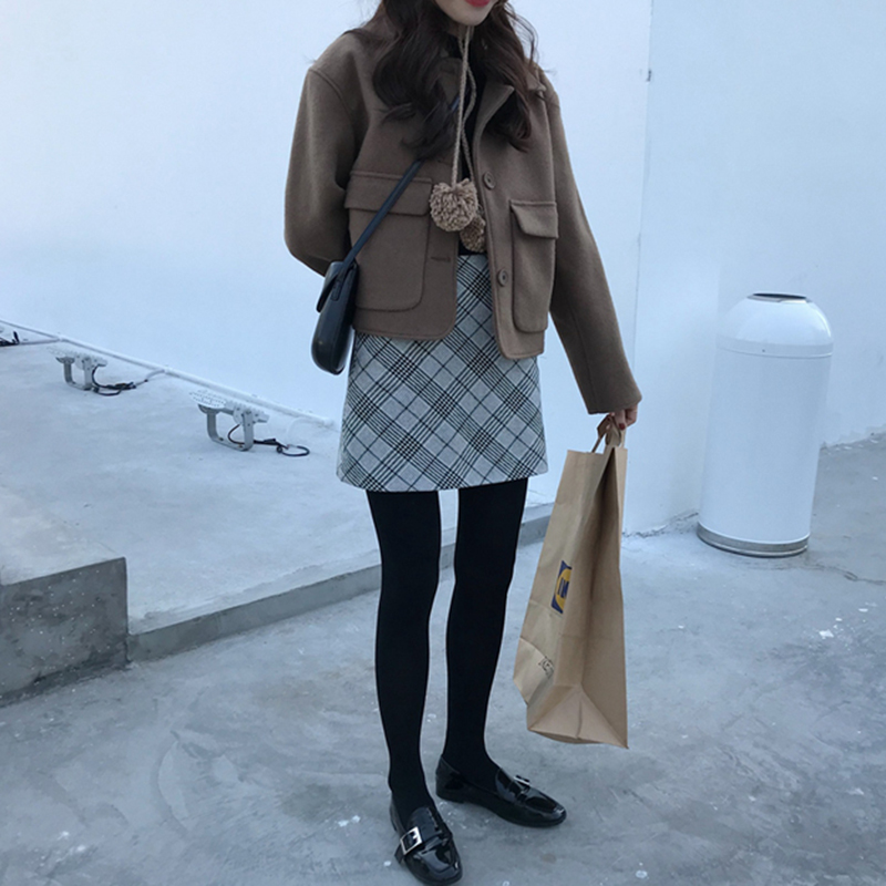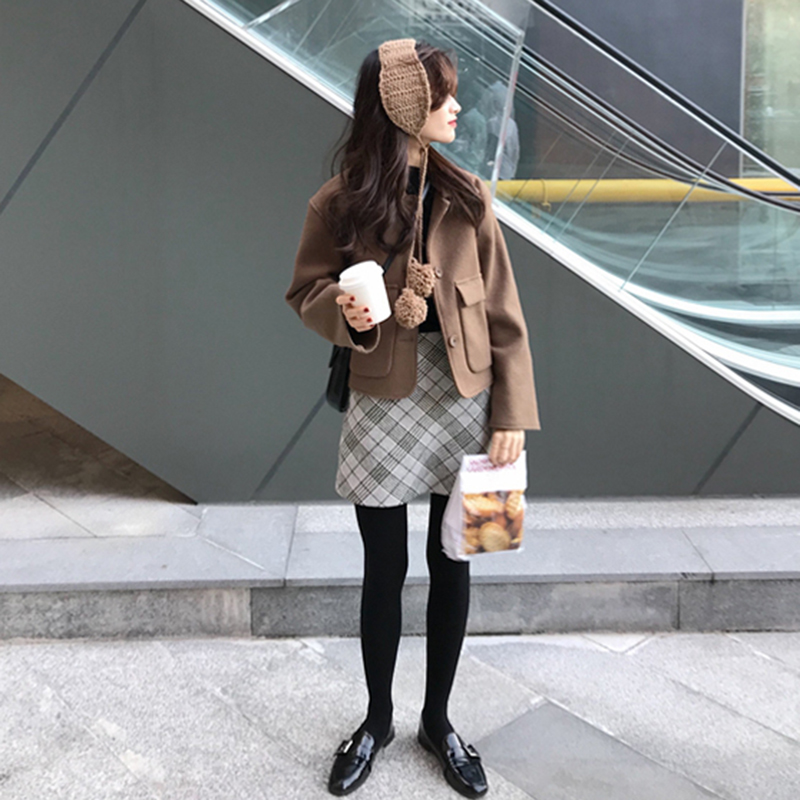 / 女神套裝女秋冬新款寬松翻領毛呢段外套氣質高腰格子A字半身裙子