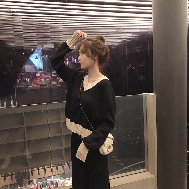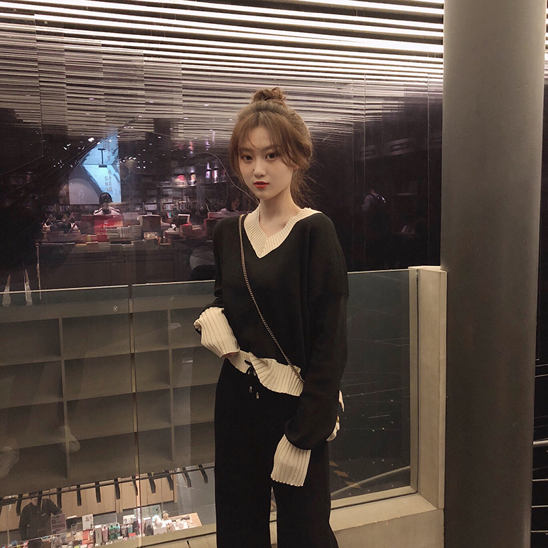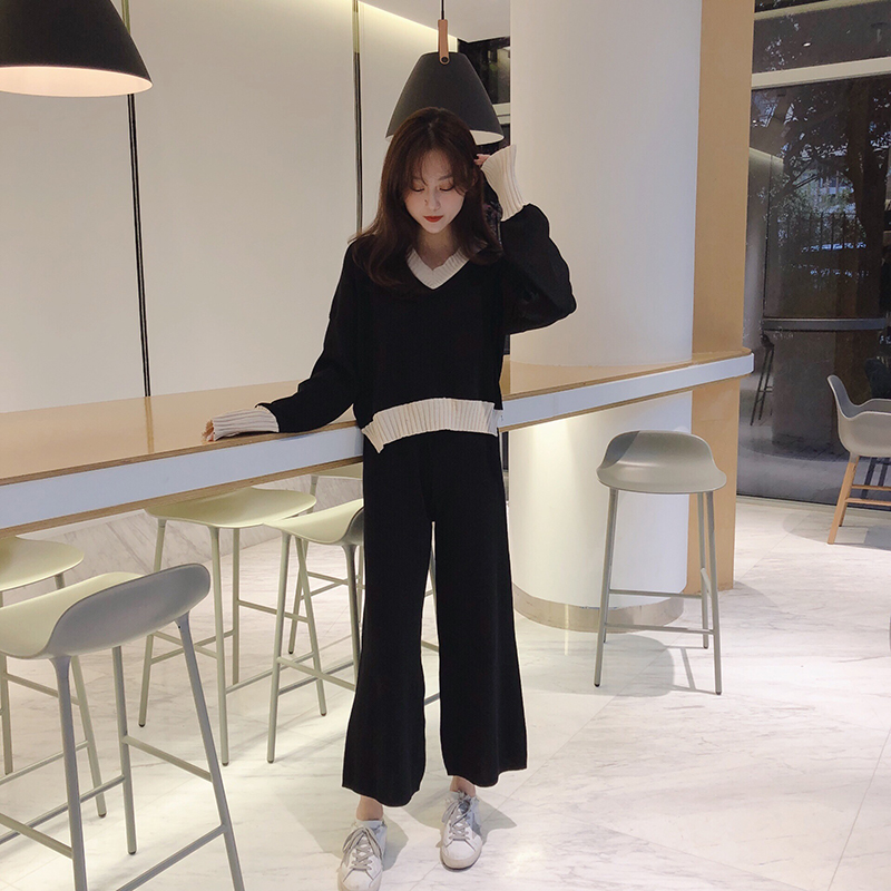/ 港味時尚女神套裝秋冬2018新款洋氣質針織毛衣+寬松闊腿褲兩件套