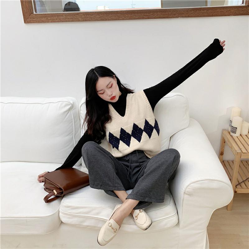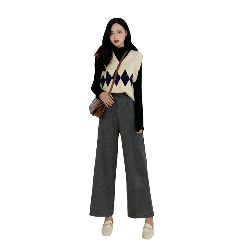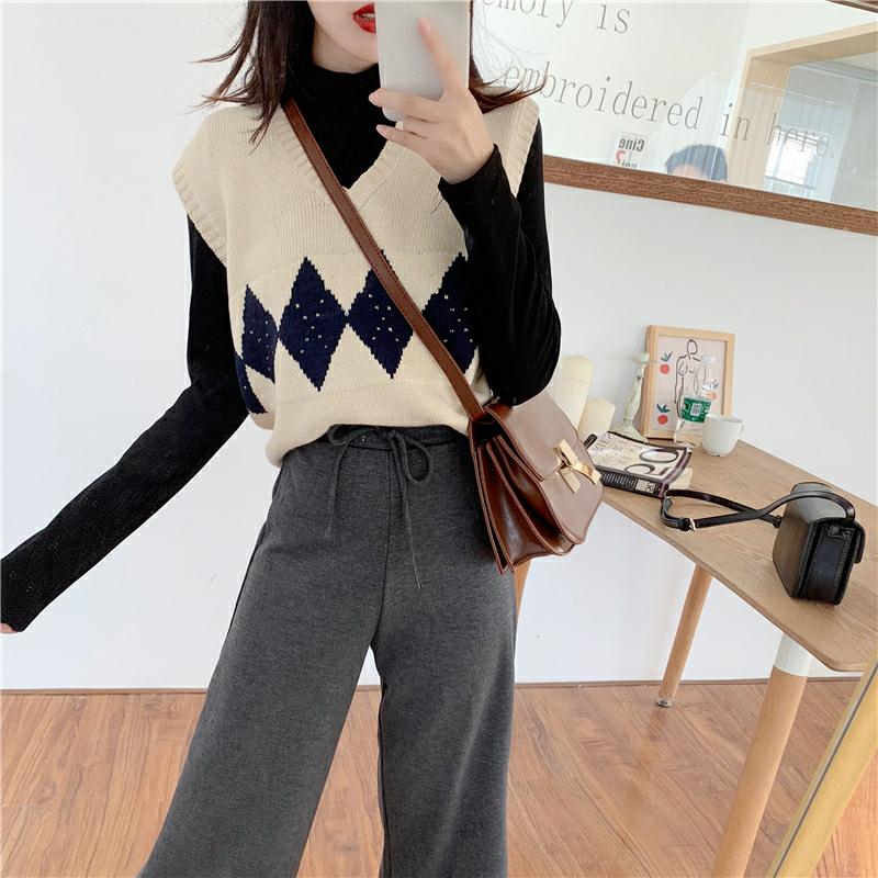 2018秋冬新款韓版V領馬甲針織背心高領打底衫百搭闊腿褲時尚套裝