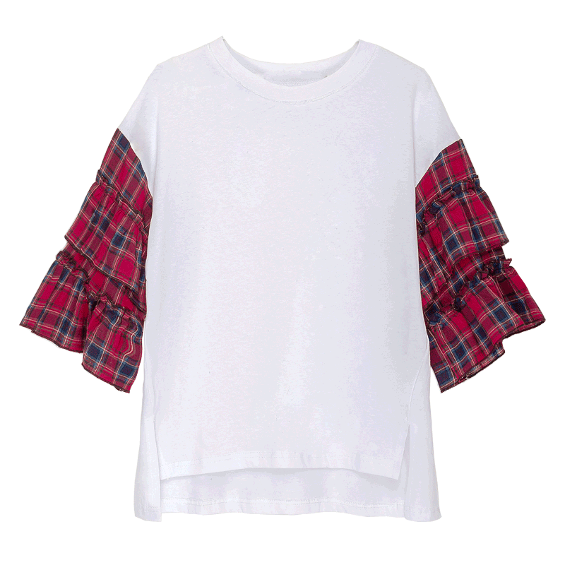 / 春夏裝韓版chic復古喇叭袖格子休閑拼接T恤衫寬松顯瘦上衣