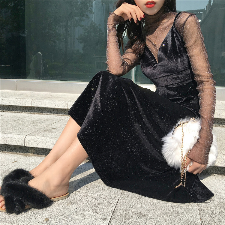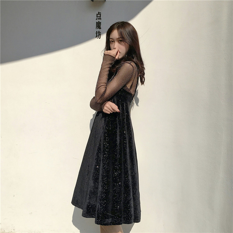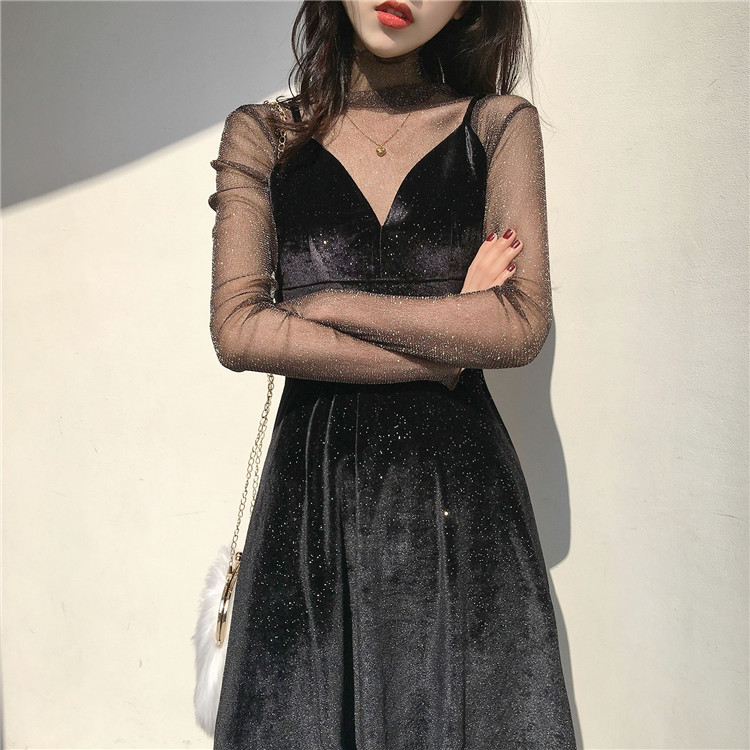 2018新款韓版氣質女人味深V領絲絨吊帶連衣裙網紗打底衫chic套裝