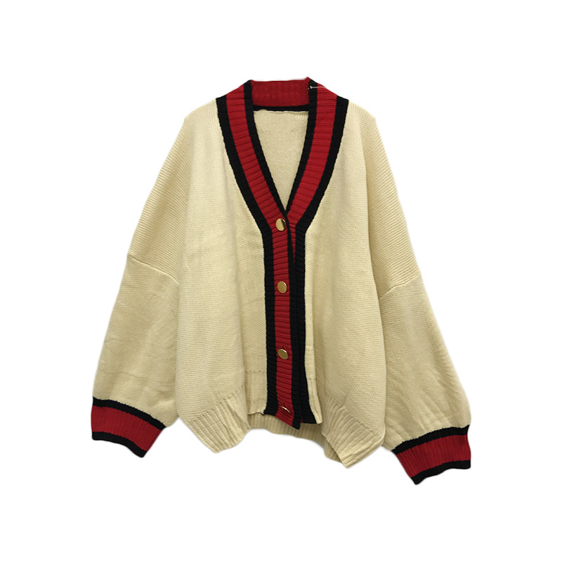韓國時尚慵懶風百搭時尚撞色V領單排扣長袖寬松針織外套上衣開衫
