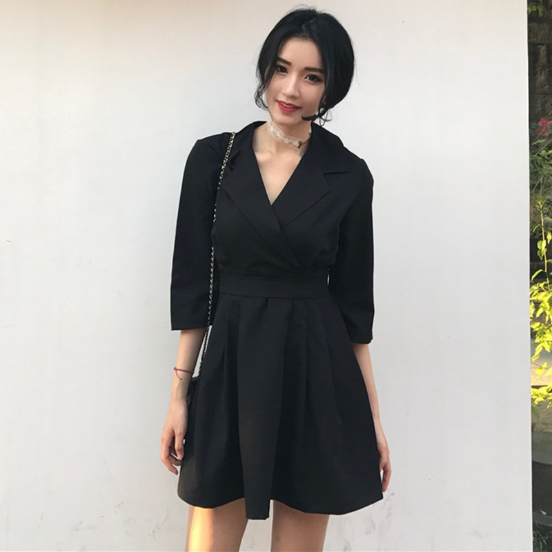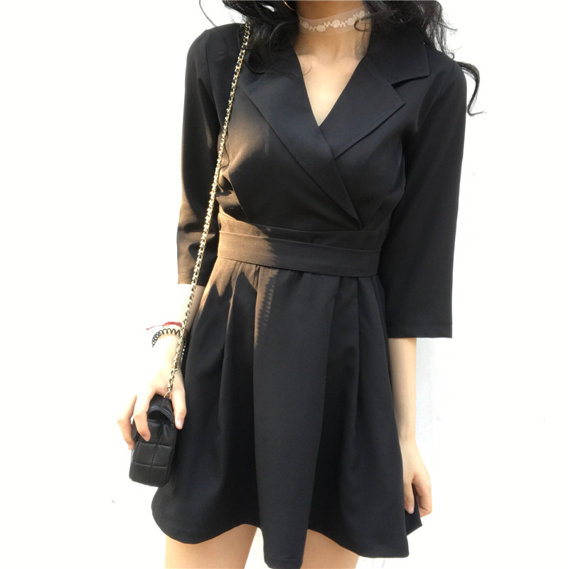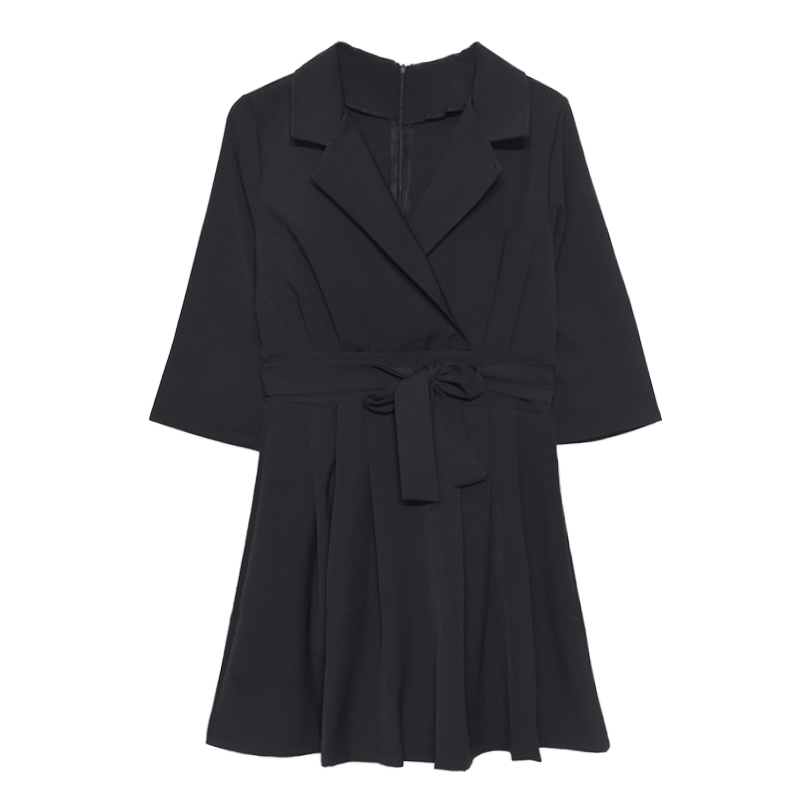 港味復古韓國chic風復古氣質V領高腰連衣裙百搭綁帶五分袖中長裙