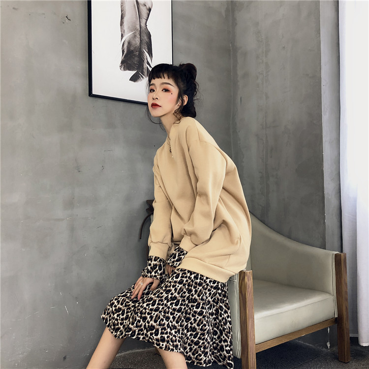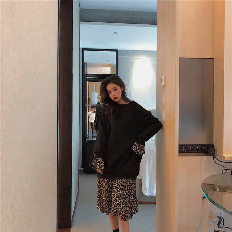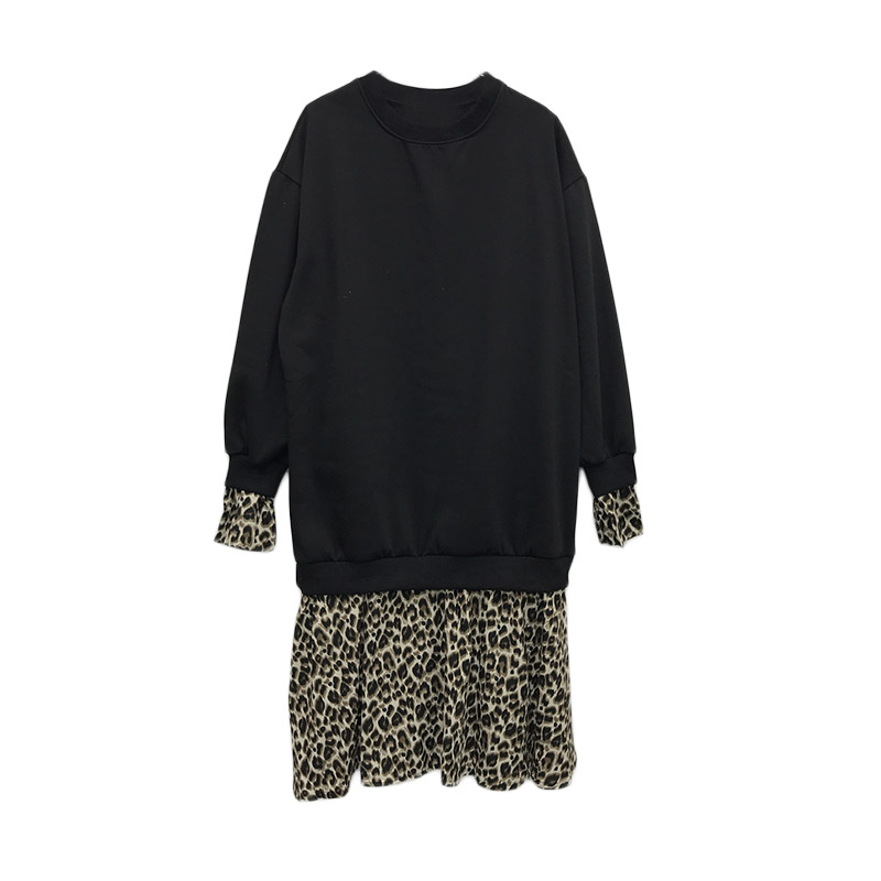 / 韓國chic風秋裝女2018新款裙子加絨百搭圓領假兩件拼接豹紋連衣裙