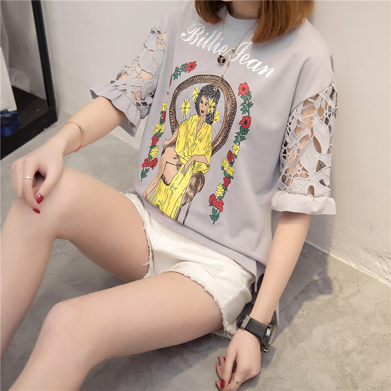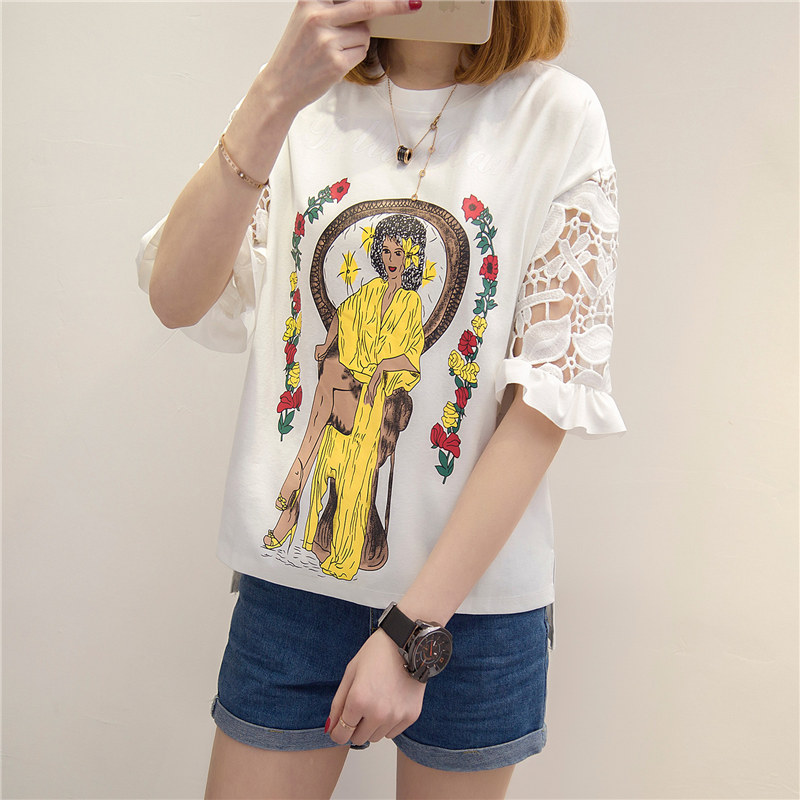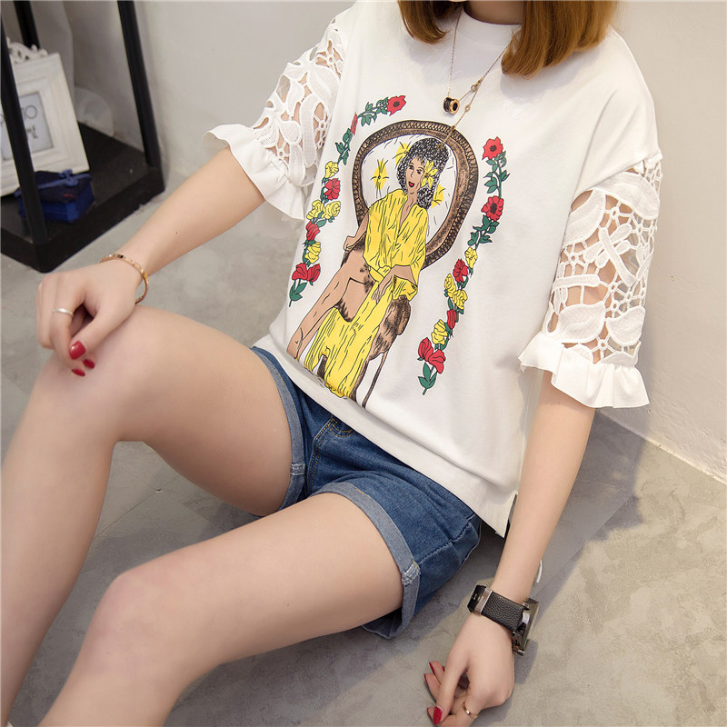 / 女裝春裝新款韓版潮白色蕾絲t恤女中長袖寬松百搭打底體恤衫